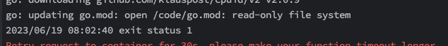 go mod tidy命令时提示文件只读,可能是因为函数计算平台默认将代码文件设置为只读模式,无法修改文件。您可以尝试在代码中使用