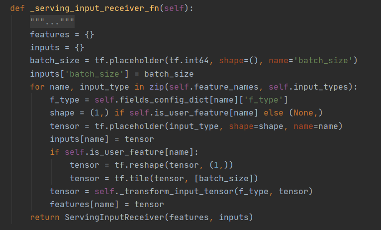 机器学习PAI中能帮忙看看我这个问题吗? 自定义了serving_input_receiver_fn, 结果用tf serving部署报错了。serving_input_receiver_fn 里面, 一条user feature 对应 batch_size条 item feature, 所以我想在模型中实现broadcast,这样tf serving 请求的时候不用传 batch_size条 user feature
