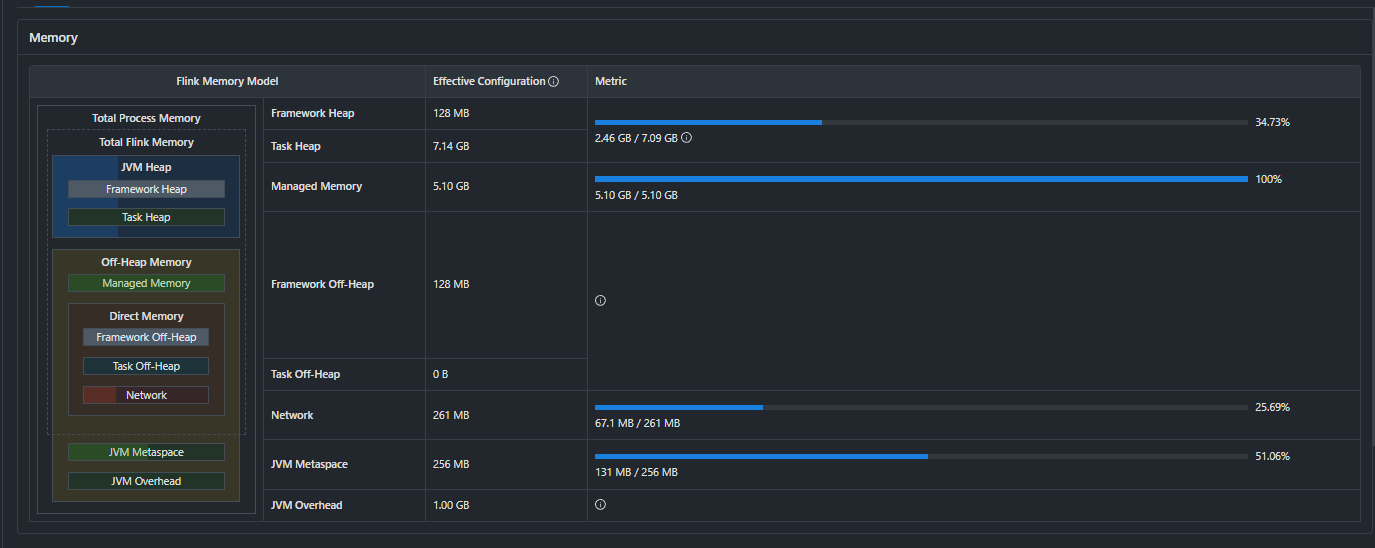 taskmanager.memory.process.size:TaskManager的总内存大小。taskmanager.memory.flink.size:Flink框架使用的内存大小。taskmanager.memory.managed.size:托管内存大小,用于排序、哈希表等操作。taskmanager.memory.jvm-metaspace.size和taskmanager.memory.jvm-overhead.fraction:JVM元空间和JVM开销的内存配置。确保这些配置与你的实际资源相匹配,并且没有过度限制或过度分配。